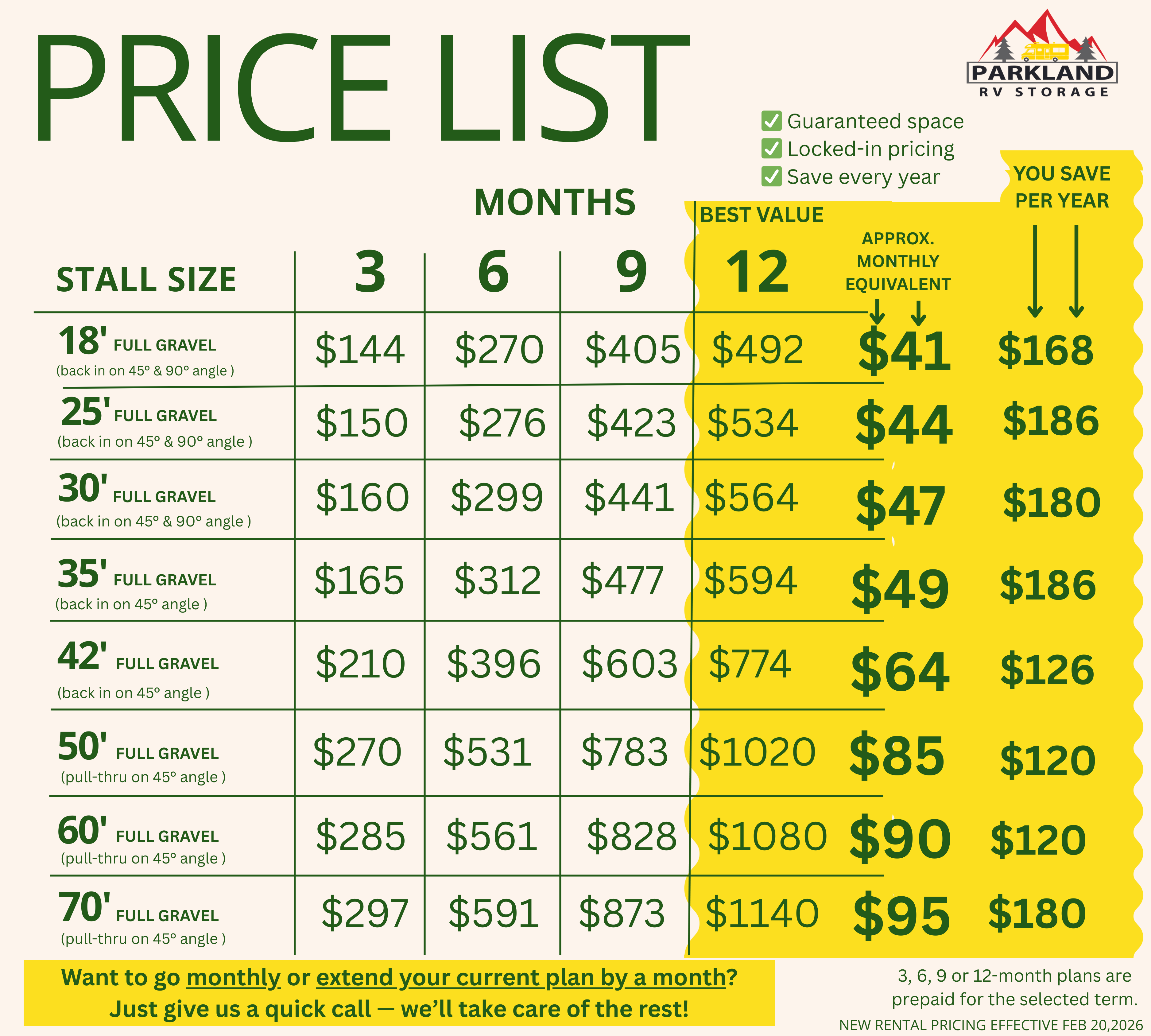 We’re a non-commercial facility, so our storage spaces are just for personal RVs, trailers, and boats — not for contractor or commercial use.